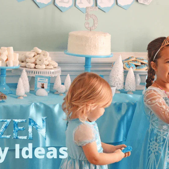 Check out this incredible Frozen birthday party by At Home With Natalie! She styled this cute dessert table with creative Frozen themed treats for all of her little Elsa and Anna party guests to enjoy.
