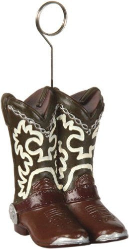 Keep your balloons weighted down or show off your favorite photos with this balloon weight/photo holder shaped like a pair of stylish brown cowboy boots. Each duck is 3'' tall and has a metal ring attached to tie the balloons to hold up the pictures for decoration. Perfect for birthdays. Includes 1 balloon weight.